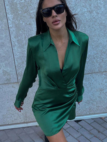 Irvingwad Solid Color Sexy V-neck Pleated Long-sleeved Dress